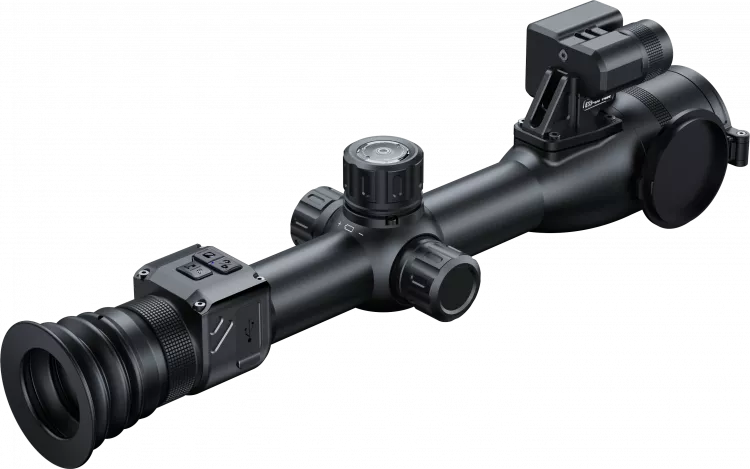 Управление прогрессивное, из трех блоков: энкодер сверху, 3 кнопки на окуляре под быстрые функции (смена режима, ИК-подсветка и дальномер) и кнопка питания, вынесенная на левый бок корпуса. Кнопки прорезиненные, нажимаются со звуком или бесшумно (под разные условия проще подстроиться), рассчитаны на прямой доступ как с левой, так и с правой стороны.