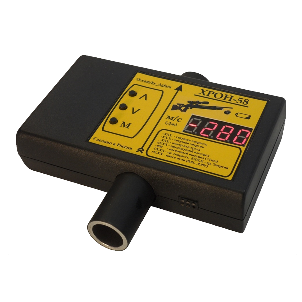Хронограф "Хрон-58" предназначен для измерения начальной скорости пули пневматического оружия. Тип - оптический, то есть фиксирует любое тело (будь то свинец, сталь или пластик), прошедшее по центру трубки прибора.